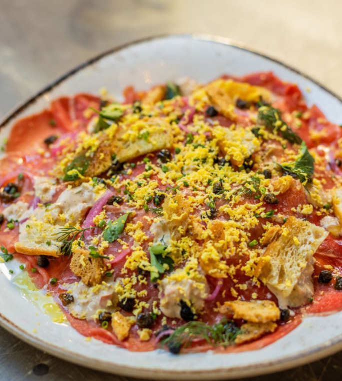 Top with a drizzle of the remaining Remoulade, pickled red onions, egg, capers, chives, parsley, and dill.