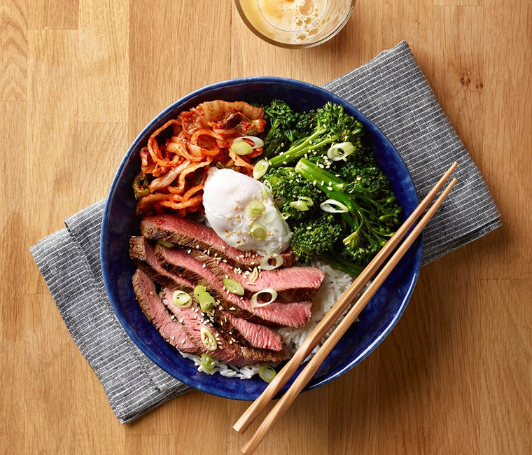 Assemble each bowl with 1 cup steamed rice, 4 ounces sliced steak, ¼ cup kimchee, ¾ to 1 cup broccoli, and top each with a poached egg. Garnish with sesame seeds and green onion, as desired.