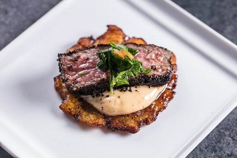 4. For each bite, layer one hot tostone with 1 teaspoon aioli and top with a slice of beef. Garnish with parsley and tomato brunoise.
