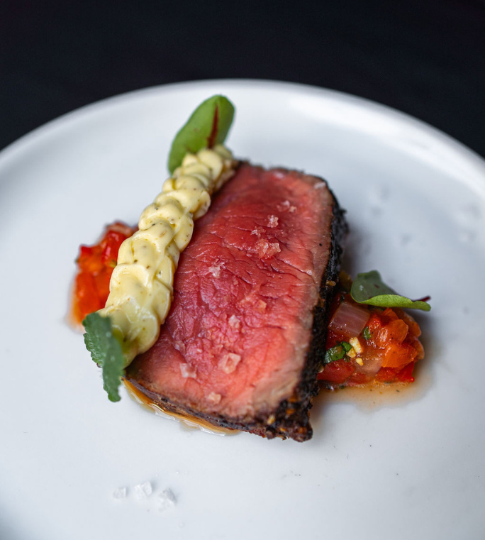 with achili pomegranate ezme, bush tomato dust, and lemon myrtle whipped bone marrow butter