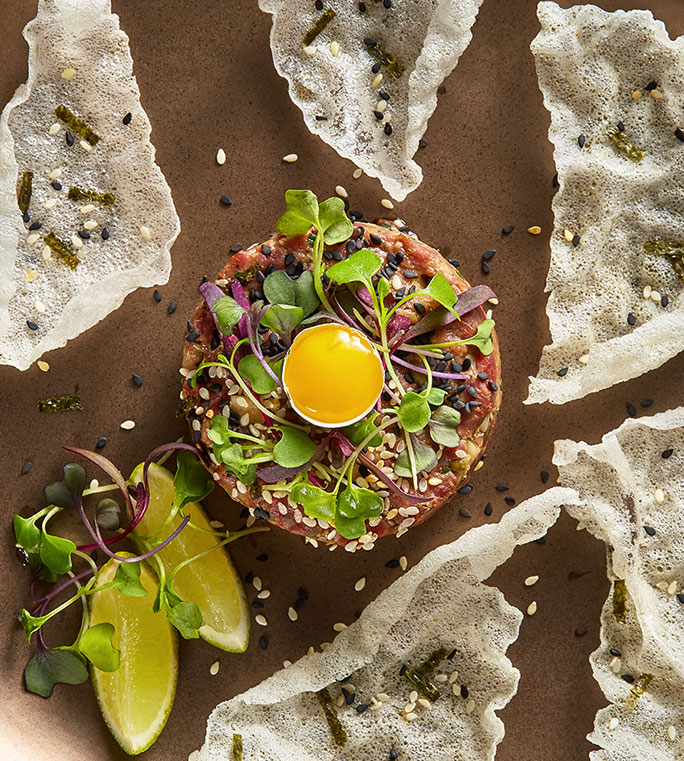 For each serving, gently pack 4 oz tartare in a 2-in ring mold slightly off center of each plate. Garnish with a pinch of furikake. Arrange 4 large leaves of butter lettuce fanned out above tartare.