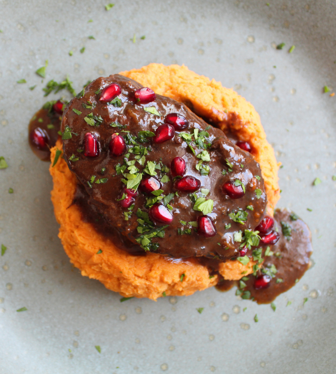 Transfer the hot sweet potatoes to a platter, top with the short ribs and sauce, garnish with pomegranate seeds, and microgreens. Enjoy!