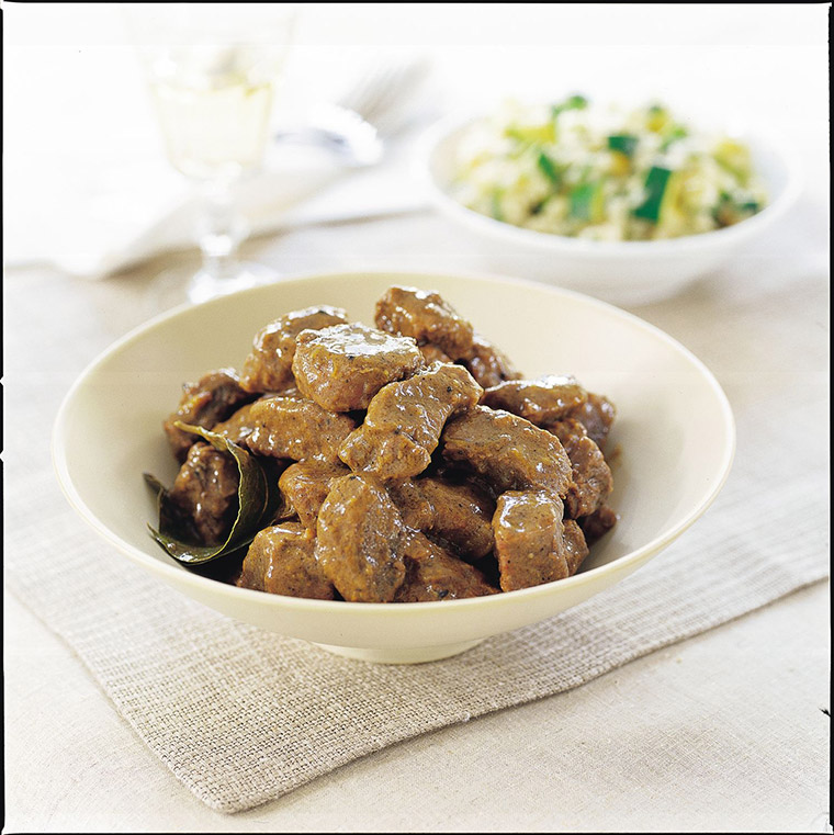 Rub the goatmeat with the ground spices, crushed peppercorns, salt, orange zest and juice. Arrange in a casserole and add the olive oil, the white wine and the bay leaves. Place in the oven at 350°F, uncovered, basting at regular intervals for 45 minutes. Serve with an herb risotto.