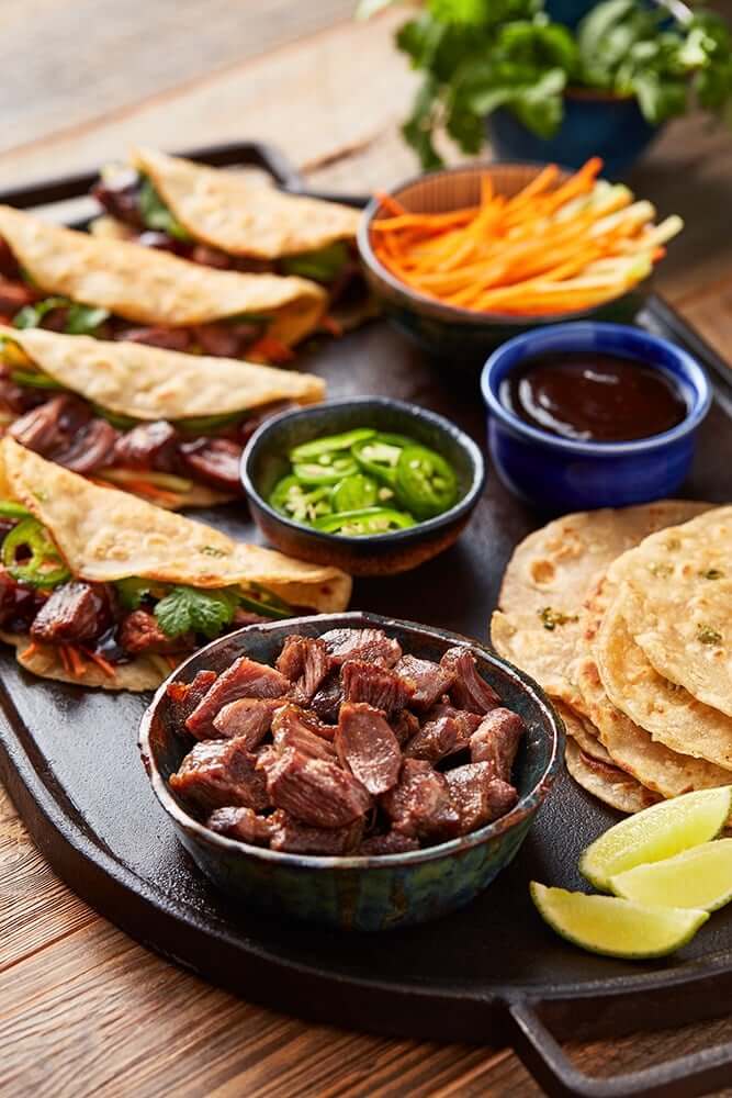 Evenly distribute the vegetable mixture into 2 scallion pancakes. Top with warmed braised goat. Garnish with a drizzle of hoisin and top with the jalapeños and cilantro.
