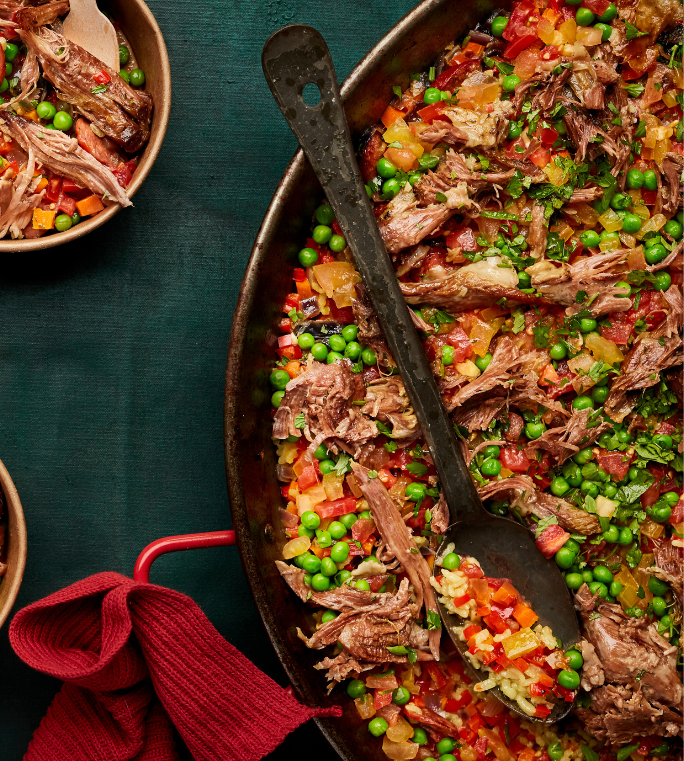 A rich and aromatic Goat Paella slow-cooked to tender perfection, layered with saffron-infused rice, chorizo, vegetables and fresh herbs for the ultimate communal feast.