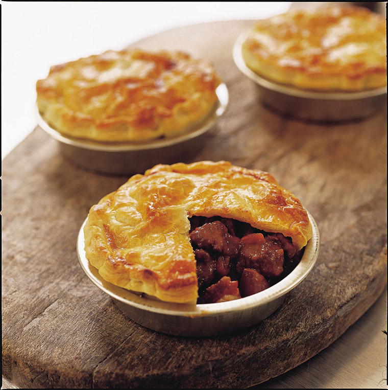 Divide the pie mixture between four 1-cup capacity ramekins. Top with rounds of pastry, trimming the edges. Cut a slit in the top of each and glaze with egg wash.