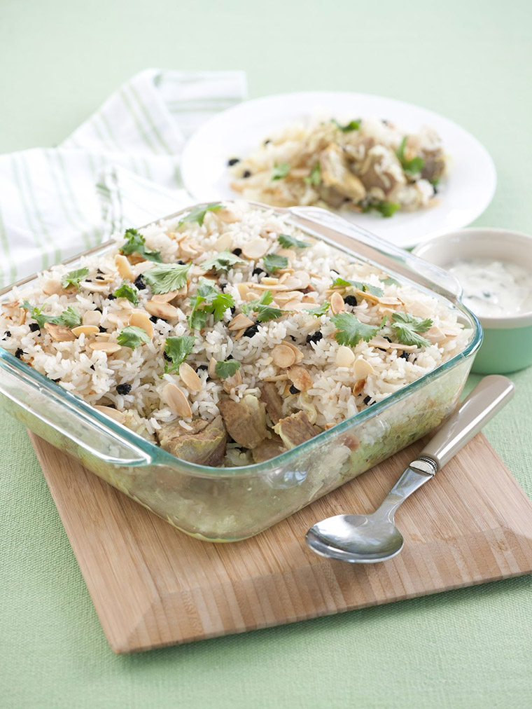 Add lemon juice and currants to the rice and mix through lightly with a fork. Cover again and allow to steam 5 minutes before serving. Sprinkle with almonds and coriander and serve with yogurt and mint sambal.