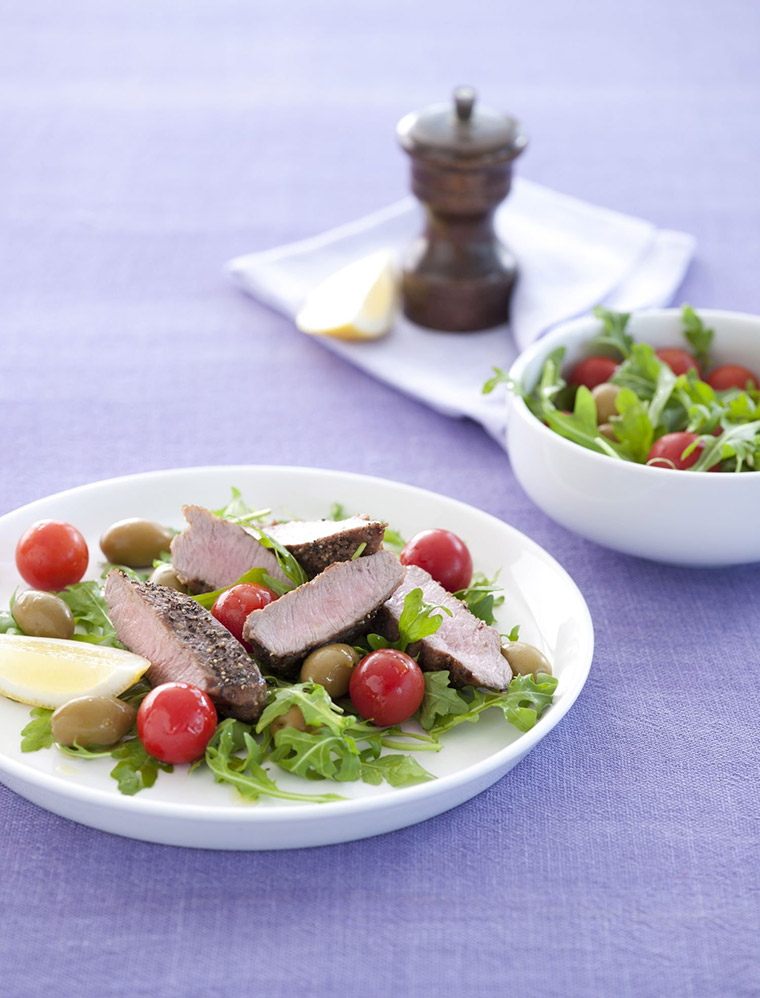 To serve, slice the meat and serve with a simple salad of cherry tomatoes, rocket and olives.