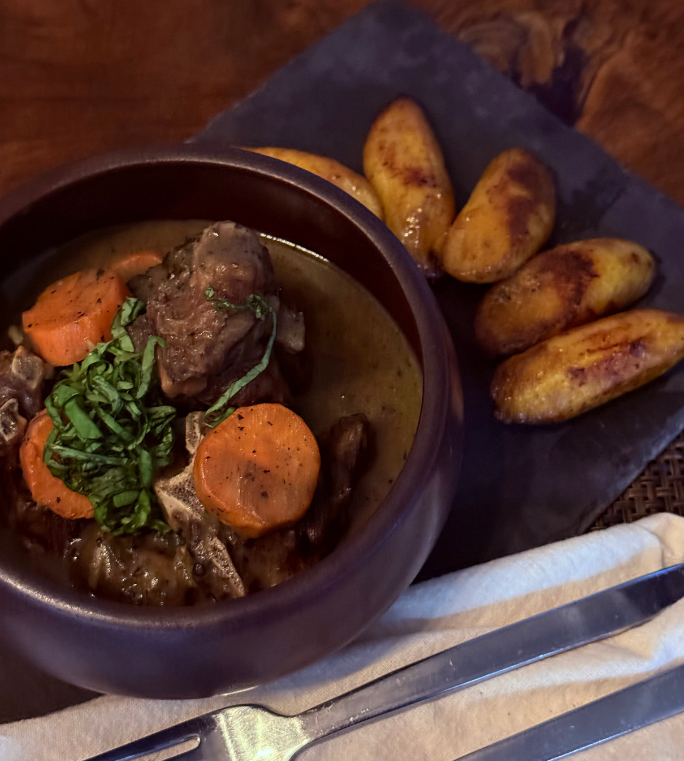 The soup should be athick broth when you’re done. You can also use a slurry in the end if the desiredviscosity is not reached by the time the meat and yam are ready.Double check the seasoning and adjust as needed.