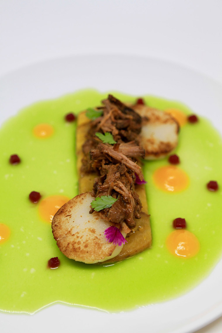 To serve: Shingle plantain on an angle at the center of the plate. Place seared scallops on opposing the ends of the plantains. Top with goat ropa vieja. Place butternut squash gel & pickled beet throughout the plate. Pour rapini consume on either side of the plantains to flow organically. Garnish with micro cilantro, micro pepper flowers and maldon salt.
