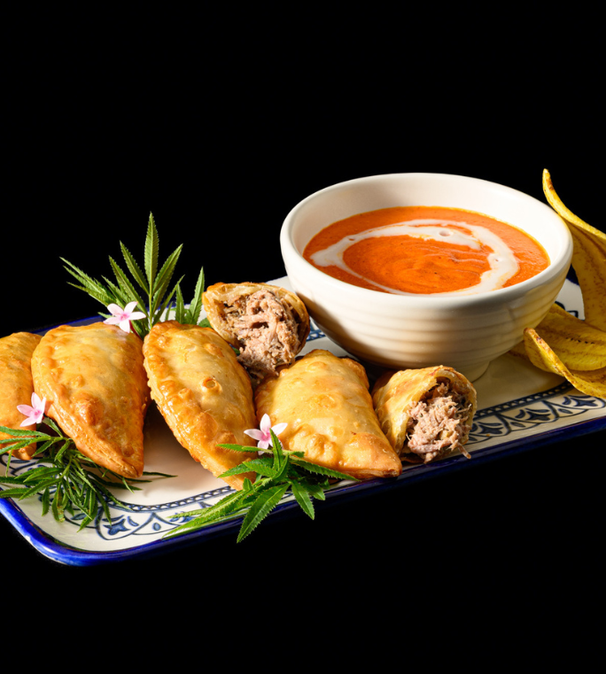 Serve hot empanadas with plaintains and curry sauce and garnish with fresh cilantro and mint.
