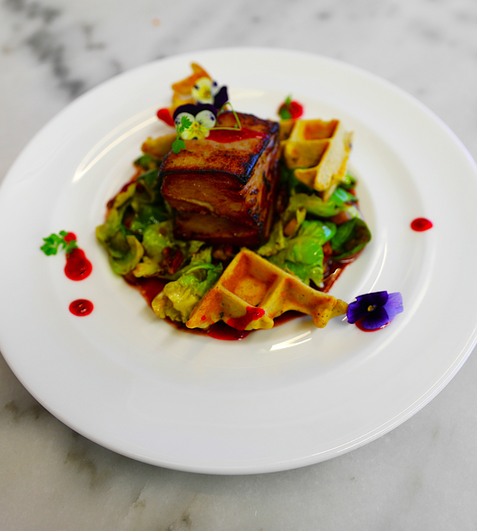 with Cranberry–red wine lamb demi-glace and wilted Brussels sprout petals sauteed with toasted pecans, diced apple, shallot, and a splash of apple cider vinegar
