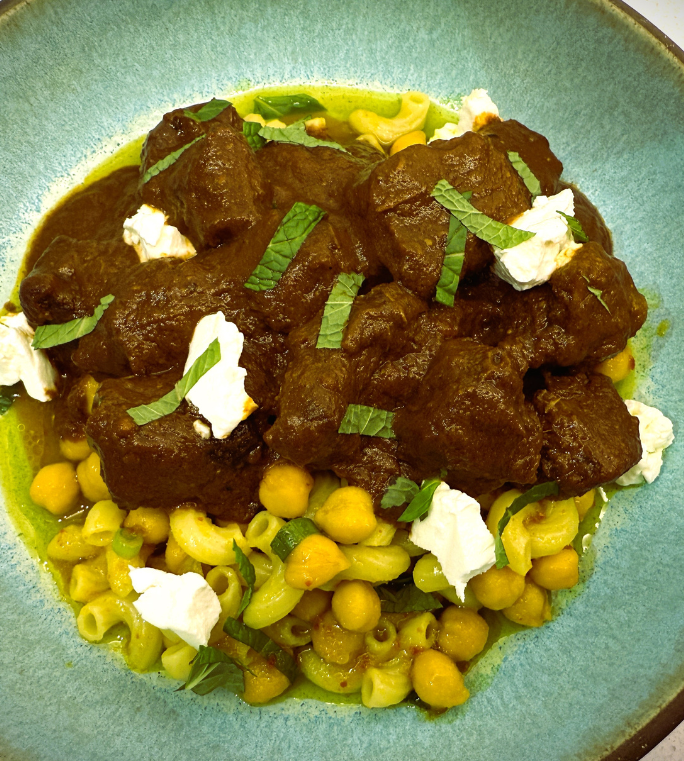 Place the lamb back into the pot and add 2 quarts of the stock, the tomatoes, molasses, and coffee. Cook for 3 to 4 hours on low heat until the meat is tender but not beginning to break apart.
