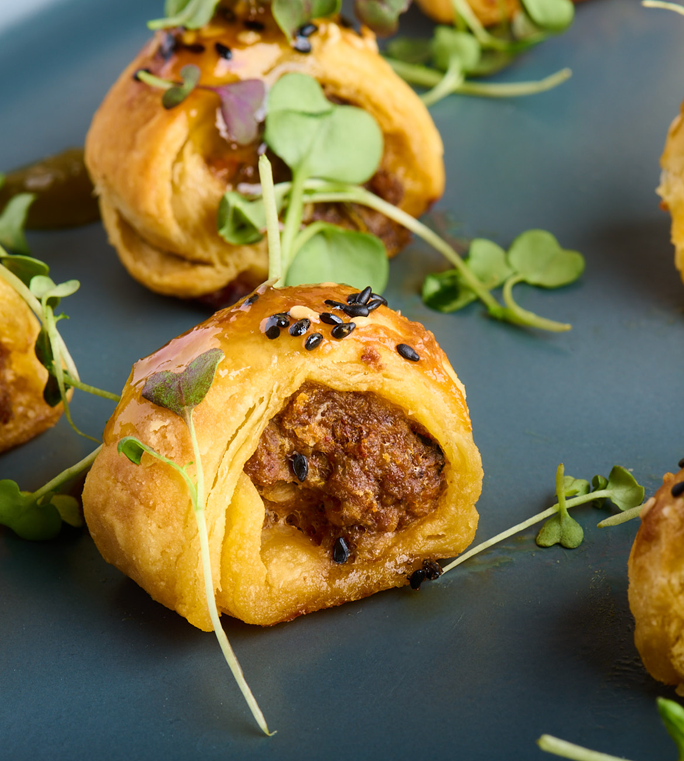 Brush one side with egg wash and roll the pastry over on itself, sealing the bottoms edge to create the sausage roll. Cut into 8 pieces, shape each one and place on sheet pan with parchment paper. Brush with egg wash and sprinkle with seeds and sea salt. For best results chill for 30 mins. Bake at 400F for 20-25 mins until golden and crispy. Serve with a dollop of tomato jam.