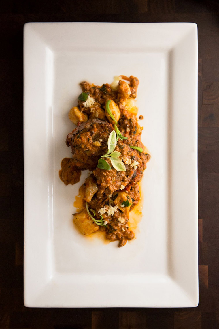 Place cooked lamb brachiole over gnocchi and Bolognese mixture. Serve immediately garnished with fresh herbs.