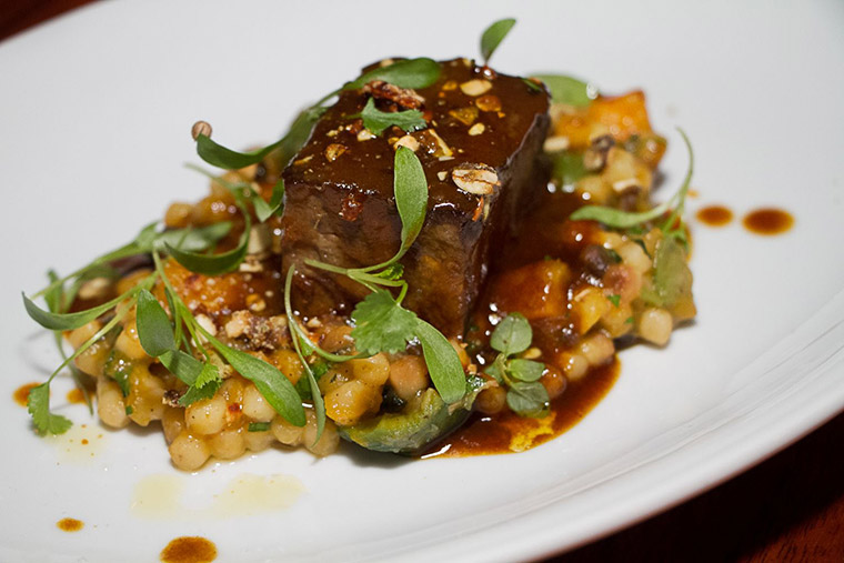 Spoon the fregola onto the plate, place a curry braised lamb shank on top. Top with a spoonful of the curry lamb sauce and a pinch of the toasted pumpkin seeds.
