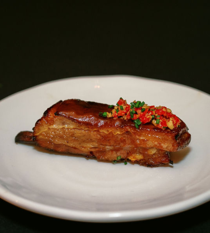 Prepare a grill for medium heat; oil grate. Working one at a time, dip ribs into glaze to coat. Grill ribs, turning several times, until glaze is lightly charred, about 5 minutes total. Transfer ribs to a platter; season with salt. Drizzle with remaining glaze and reserved oil. Garnish with Pickled Fresno chillies and crushed peanuts plus a squeeze of lime juice. Season with salt. Top with micro cilantro and chive.