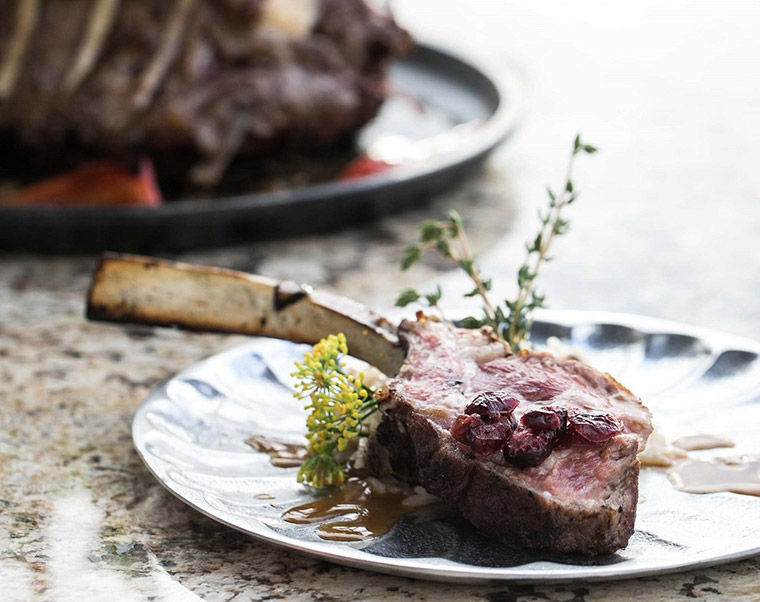 12. Slice rack into individual chops. Serve warm sprinkled with fennel dust atop warm risotto.