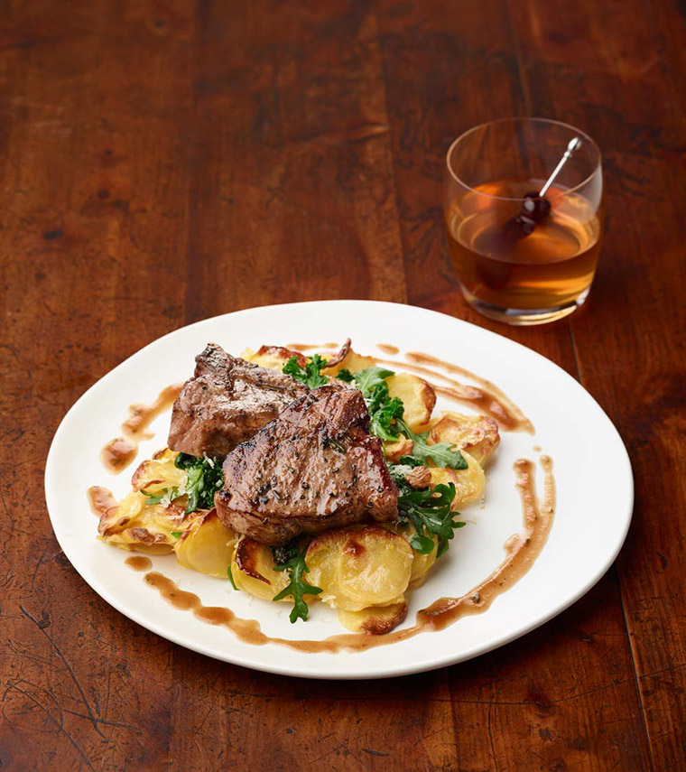 Nape pan jus over chops, potatoes and around plate.