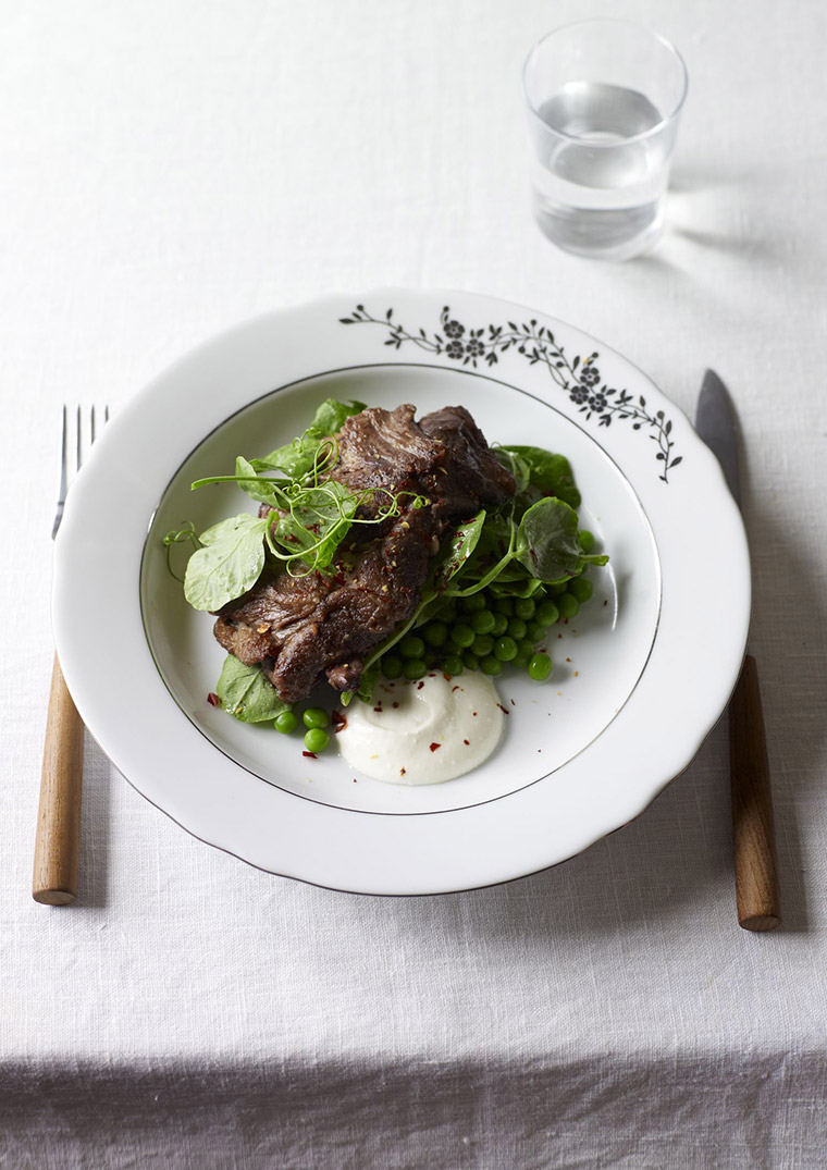 Lamb neck with pea shoots, aleppo pepper, greek yogurt and lamb jus