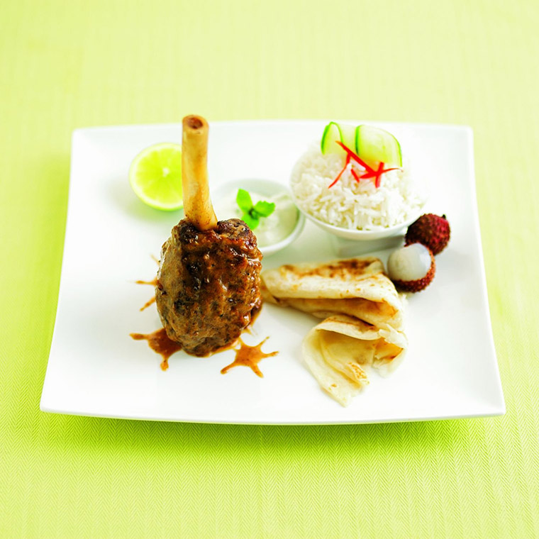 Serve lamb rogan josh with steamed basmati rice, roti and sides.