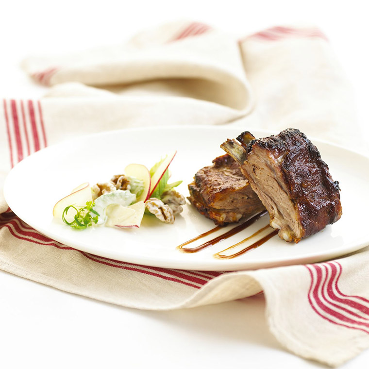 Combine the Waldorf salad ingredients in a large bowl and toss well. Arrange salad and lamb ribs decoratively on individual serving plates. Drizzle with a little extra barbecue sauce and serve.