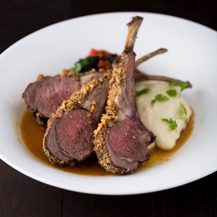 For the lamb: Using a standard breading procedure, coat the lamb rack with the walnut breading. Preheat an oven to 350F and roast the rack for 15 minutes, or until an internal temperature of 125F. Let the rack rest for 10 minutes before slicing.