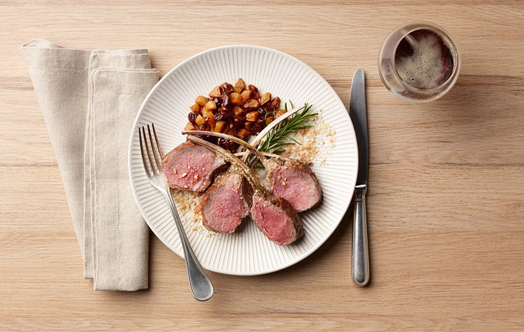 For each serving, plate 4 chops, ½ cup relish, and 2 tablespoons almond meal. Garnish with a drizzle of olive oil and a rosemary sprig.